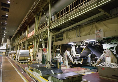 名古屋製造所の冷間圧延工程では、幅2m、外径2mを越える大きなアルミニウム板コイルが生産可能です。コンピュータ管理されたコイル搬送システムと、自社開発の制御システムを活用することで、世界トップクラスの高速圧延下でも、高い精度を実現。全長に及んで板厚が均一で、幅方向のひずみが小さいアルミニウム板を製造しています。