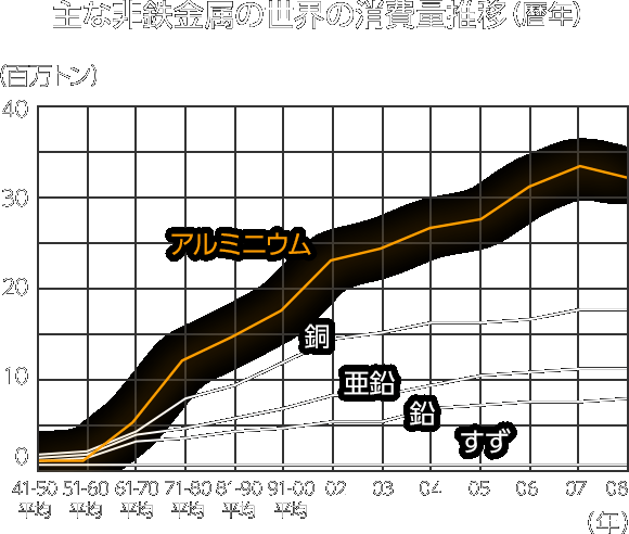 軽くて強く、リサイクル性にも優れた金属「アルミニウム」。これらの特性を活かし、幅広い分野にわたって活躍しています。消費量は全世界で飛躍的に伸びており、他の非鉄金属と比べてもその伸びは顕著。私達の生活やビジネスなど、あらゆるシーンをアルミニウムが支えているのです。