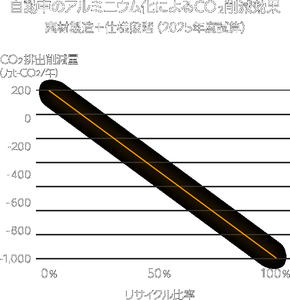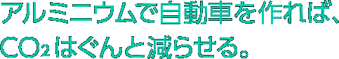 自動車のの大部分は鉄でできていますが、鉄の代わりにアルミニウムを使うことで、排出するCO2を減らすことができます。製造段階では、素材に再生アルミニウムを使うほどCO2が低減。また、使用(走行)段階では、自動車の軽量化にともなって燃費が向上するため、CO2排出量の削減につながります。