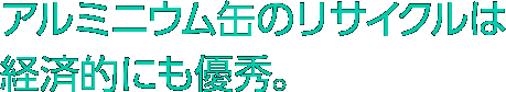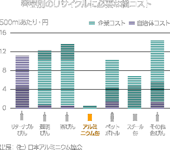 アルミニウムの大きな特長の1つが「リサイクルのしやすさ」。したがって、リサイクルに係るコストも、ほかの飲料容器に比べてアルミニウム缶が圧倒的に安価です。省資源に貢献するだけでなく、アルミニウム缶は経済性にも優れているのです。