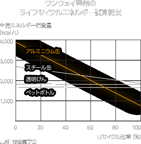 飲料容器が作られてから、使用後に回収・廃棄されるまでにかかるエネルギー量を飲料容器ごとに比べてみました。アルミニウム缶は、リサイクルすればするほどエネルギー量が低減、省エネに貢献します。