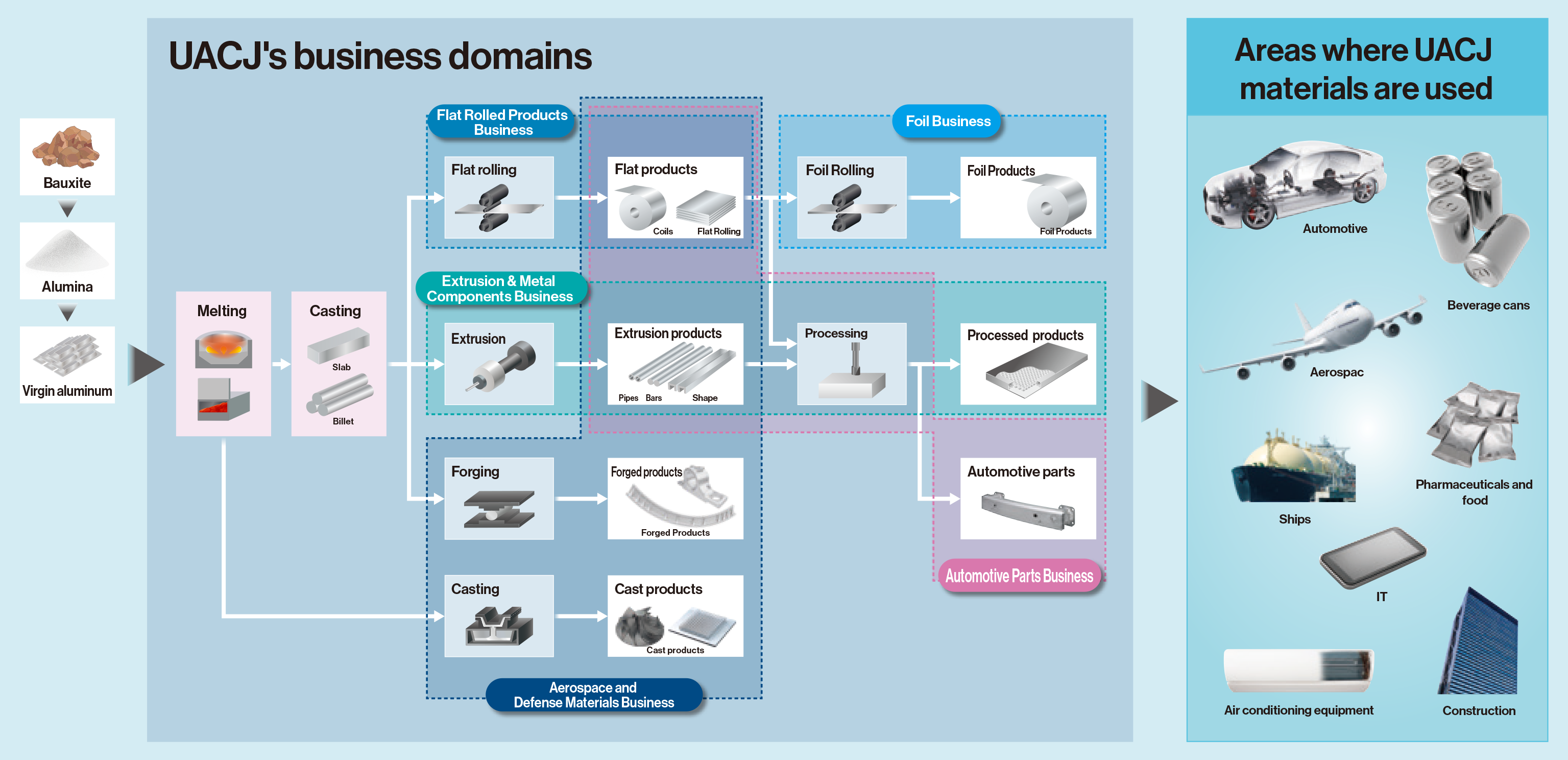 Aluminum is indispensable to society and daily life. UACJ supports customers' manufacturing through the collaboration of five businesses: sheets, extrusion and processed products, foil, automotive parts, and aerospace and defense materials.