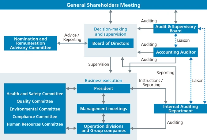 The Company utilizes an Audit & Supervisory Board system. Following the executive officer system for business execution, managerial decision-making and supervisory functions are separated from business execution, thereby strengthening the functions of the Board of Directors and accelerating the speed of business execution. To further clarify this separation and improve the supervisory function, the Articles of Incorporation stipulate that the president serves as the chief executive officer in charge of business execution.