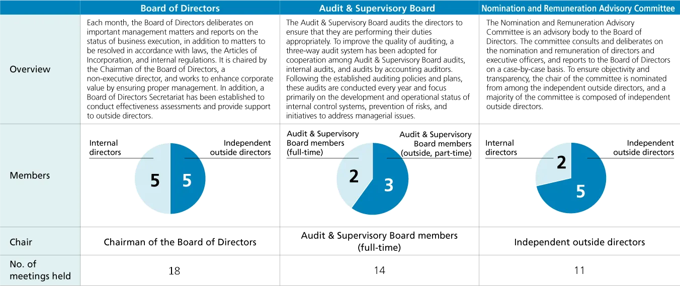 As a company with an Audit and Supervisory Board system, we believe it is essential to strengthen both the decision-making and oversight functions of the Board of Directors. Guided by this principle, we have actively worked to enhance Board effectiveness and have continuously improved its operations.