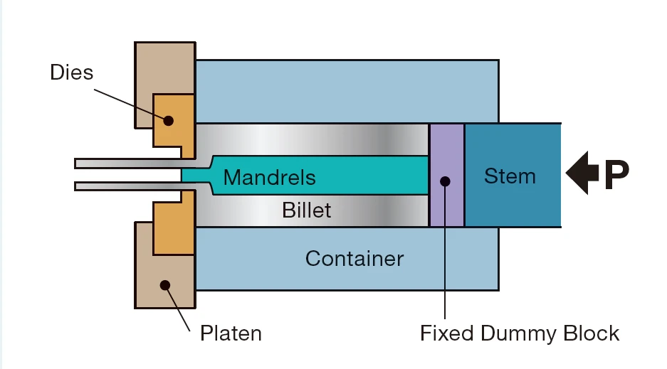 - The mandrel is placed in the center of the die and the billet is forced out to form a hollow shape (tube).