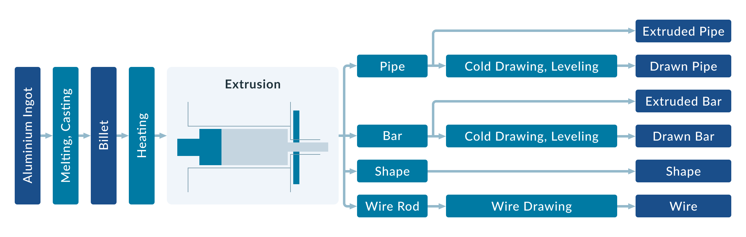 Extrusion is used to manufacture products that have different cross sections. Aluminum ingots, called billets, are extruded at high pressure and temperatures of 350°C to 550°C through dies of different shapes to manufacture products.