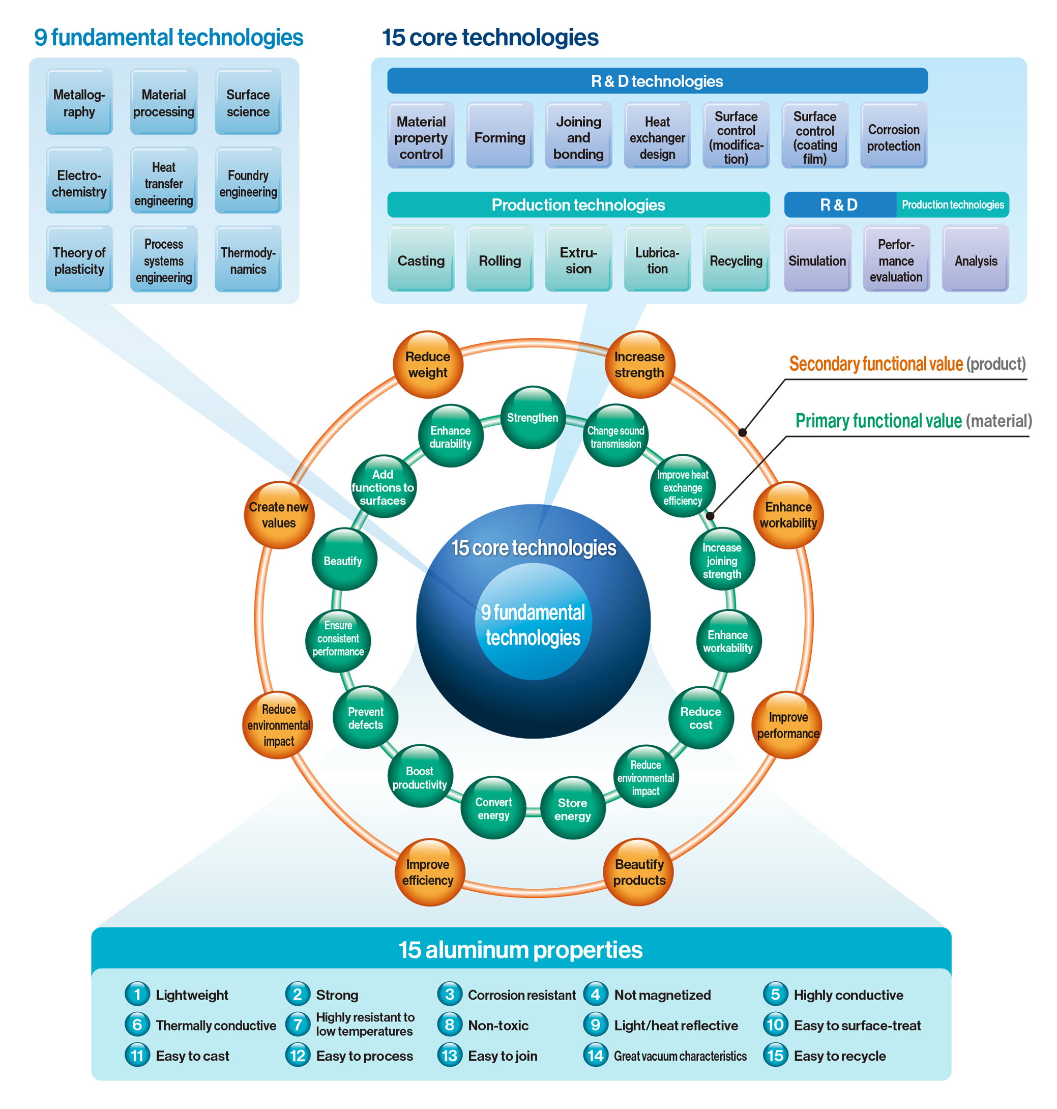 Aiming to promote innovation, the R&D Division carries out basic research with a long-term outlook for the purpose of discovering new possibilities for aluminum, and pursues product development with the goal of responding to the needs of customers, which manufacture a wide range of products spanning from everyday items like beverage cans to highly advanced rockets.