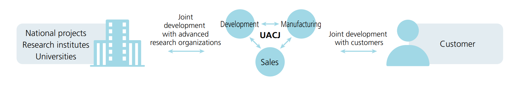 UACJ develops products beyond the borders of its own operations by co-creating with customers and participating in national projects in Japan. Having built close relationships with customers, the Company's sales departments work in close collaboration with manufacturing and R&D departments to develop and supply products that meet customers' specific needs. To provide a place for employees and customers to explore new possibilities for aluminum, the Company set up its U-AI Laboratory in 2019 as a hands-on exhibition space inside its R&D Center. Furthermore, as part of its efforts to develop aluminum products with added value, UACJ pursues research on methods for recycling various aluminum products, and develops innovative aluminum materials in collaboration with universities and Japan's New Energy and Industrial Technology Development Organization.