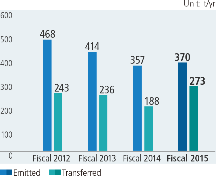 Regarding the initiatives for handling chemical substances, all Group companies record the volumes of targeted substances handled, emitted and transferred according to the Pollutant Release and Transfer Register (PRTR*1) Law. In addition to reporting these values, the Group is working to further reduce the use of targeted substances. In fiscal 2015, while product production volume increased, the overall Group-wide emissions of all targeted substances combined slightly increased by only 3.6% compared to the previous fiscal year.