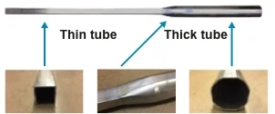 - By reducing the wall thickness at the same time as shrinking the diameter and varying cross-section shapes, it is possible to reduce the weight while maintaining strength in the necessary parts. There are cases in which the weight was reduced to half compared with conventional steel products.