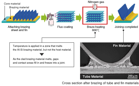- We develop highly reliable aluminum materials by determining the alloy's brazing material and cladding ratio, a diffuse interface due to the metallic composition of the core materials, and using flow control to form highly reliable joints.
