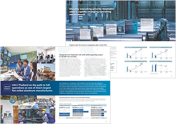 The Message from the President section of this publication leads with the statement that “We will lay a foundation for sustainable growth by improving the Company’s profitability and financial structure while continuing to implement our growth strategies.” In line with the new mid-term management plan launched in April 2018, the report explains how the Company will more actively take on a “co-developer” role both internally and externally and initiatives at R&D centers to this end. The special feature section highlights localization efforts at UACJ (Thailand) Co., Ltd., one of Asia’s largest flat-rolled aluminum manufacturers. Through an interview with local employees, the report describes how full-fledged operations are gaining traction.