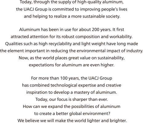 UACJ Corporation (HQ: Chiyoda-ku, Tokyo; President and Representative Director: Miyuki Ishihara) has formulated a corporate slogan and brand message to express the Group’s corporate philosophy and corporate vision.