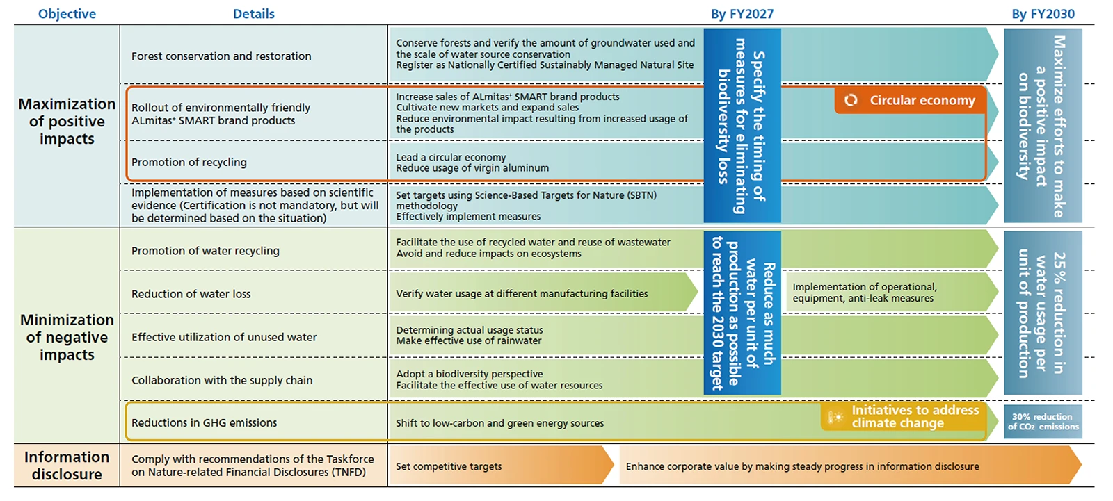 Specifically, we are actively reducing the environmental impact of our business activities through the active use of recycled materials, the recycling of water, and proactive forest conservation activities. We are also promoting the restoration and recovery of forests and water resources. With respect to water recycling in particular, we are working to reduce our environmental impact by positioning the reuse of water used in manufacturing as a routine, everyday task. We have set a target of reducing the amount of water withdrawal per unit of production by 25% from the fiscal 2020 level by fiscal 2030. We are also taking measures to minimize our impact on nature, such as reducing the use of new ingots by promoting aluminum recycling, reducing new mining of bauxite as a raw material, and avoiding deforestation and the endangerment of threatened species.