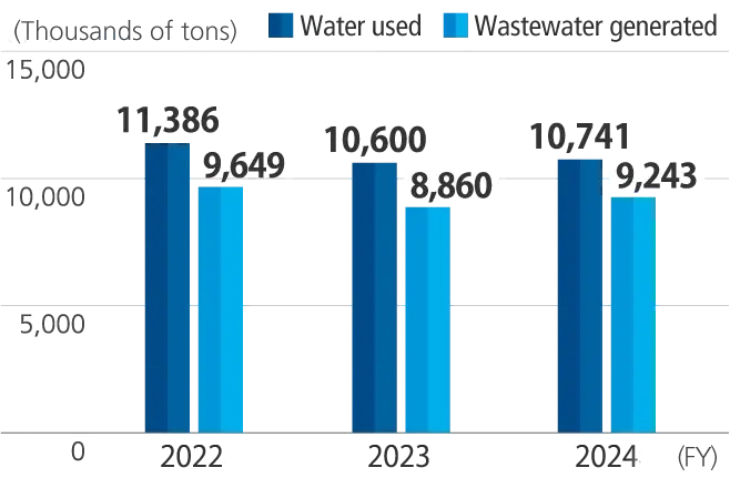 We strive to use and manage water resources effectively based on our keen awareness of these circumstances. Each of our business locations tracks its water usage by water source. Data on our water usage has been tallied and is included in the material balance information presented in the Business Activities and Environmental Impacts section.