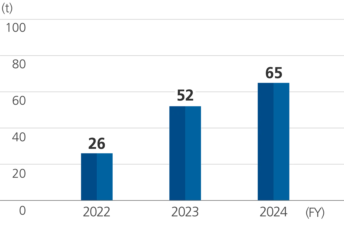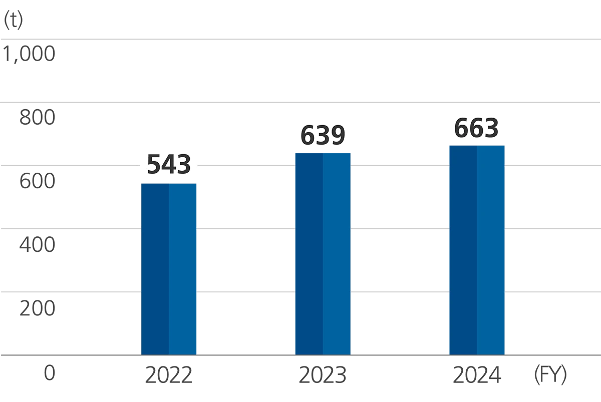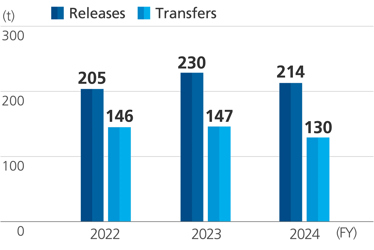 In fiscal 2024, with the increase in production volume from fiscal 2023, the handling volume increased by 43 tons (1.4%), but the group's overall emissions and transfers, across all target substances, have decreased by 26 tons (7%) and 17 tons (12%), respectively.