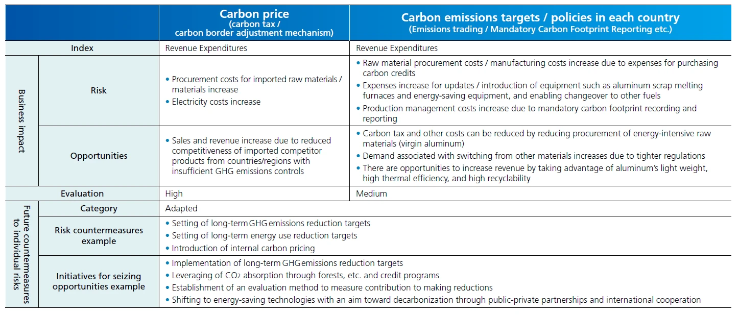 In addition, we have positioned the promotion of recycling as an important strategy in our current midterm management plan, which commenced in fiscal 2024. Recycling aluminum, encouraging its widespread use, and recycling used aluminum as resources for new products (closed-loop recycling) will lead to a reduction in GHG emissions. Moreover, by curbing the mining of bauxite, the raw material for new ingots, it will also help reduce the GHG emissions involved in the mining process. Building this kind of circular economy and contributing to Nature Positive initiatives are also Materialities for us, so we are implementing climate change countermeasures as an important management policy.