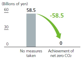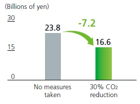 In fiscal 2023, we calculated and disclosed for the first time the financial impact in the event a carbon tax is introduced in Japan, Thailand, and other countries. We review these calculations annually in light of carbon-pricing trends at home and abroad. In the latest calculation, comparing Scope 1 and 2 outcomes for the case where we achieve our targets of reducing CO2 emissions 30% from fiscal 2019 levels by fiscal 2030 and reaching carbon neutrality by fiscal 2050 versus the case where we do not, the financial benefit from GHG reductions (avoided carbon-tax cost) is estimated at approximately ¥7.2 billion in fiscal 2030 and approximately ¥58.5 billion in fiscal 2050.