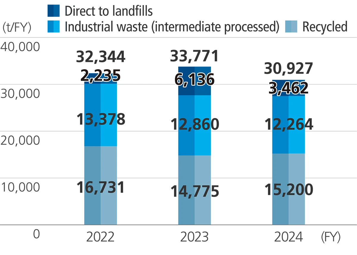 The total industrial waste generated across all business sites in fiscal 2024 was 30,927 tons, representing a decrease of 8.2% from fiscal 2023. This is the result of reduction efforts, including proper sorting and resource recycling.