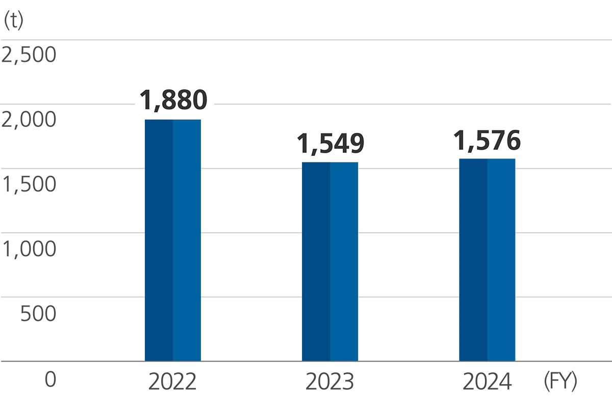 In fiscal 2024, we generated 956 tons of hazardous waste in Japan, consisting of 0 tons for direct landfill, 247 tons for intermediate treatment, and 709 tons for recycling. Overseas, we generated 10,156 tons (including 267 tons for direct landfill, 8,708 tons for intermediate treatment, and 1,181 tons for recycling). One of the ways we are reducing hazardous waste is by using sodium aluminate, a type of strong alkali emitted from the extrusion process, as a neutralizer for wastewater treatment at paper mills.