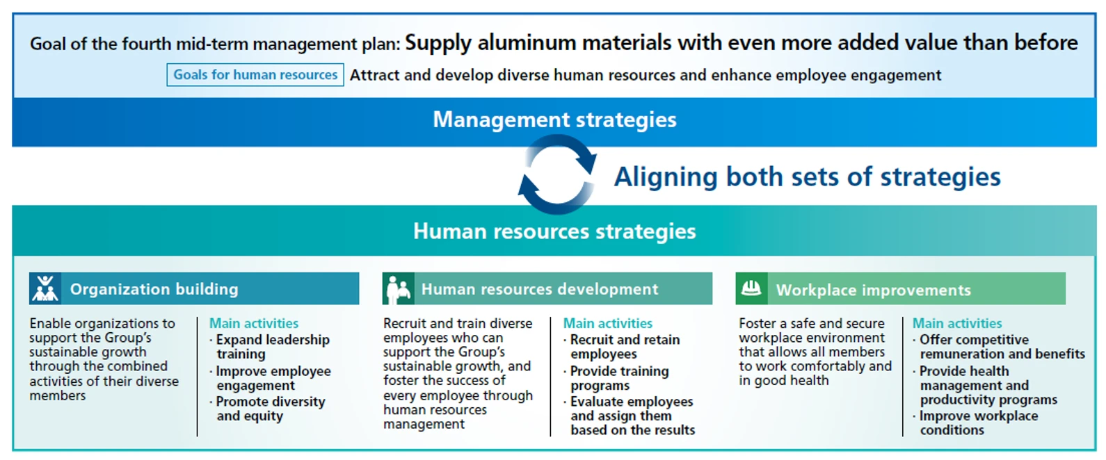 The newly formulated UACJ "People Statement," which articulates our Group’s approach to human capital, and our "overall framework for human capital management," which systematizes our human resources strategy, place emphasis on the well-being of each and every employee in the Group, in addition to our conventional human resources strategy perspectives.