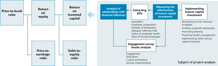 With this in mind, we are working to summarize the relationships between human capital, financial performance, and corporate value improvement, and have begun formulating measures to further enhance corporate value and exploring how we can best capitalize on these relationships. We believe that analyzing the correlations between financial indicators and human capital measures, such as various human resource policies, the promotion of diversity, and the practice of health management, should be used as a reference in developing human resource strategies to improve corporate value.