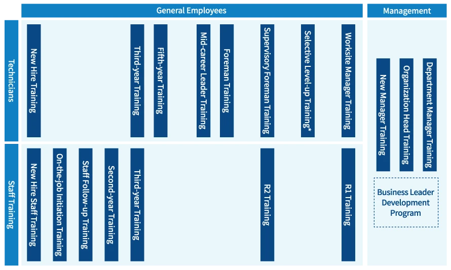 The purpose of job-level training is for employees to sharpen awareness of their job-level roles, acquire the professional capabilities and knowledge required to fulfill their job responsibilities, and deepen their understanding of the company’s aims and systems.