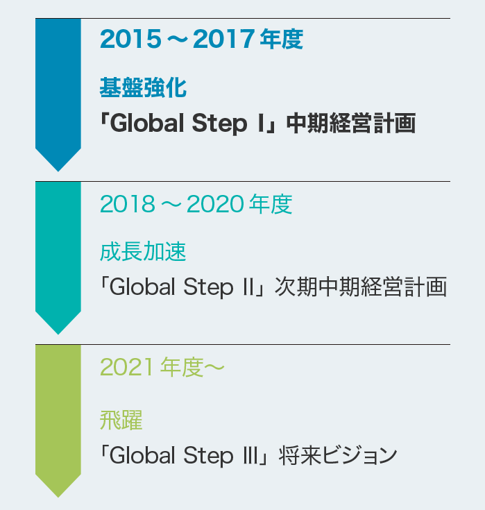 2014年12月には、この将来ビジョンの方針を各事業の戦略へと展開した中期経営計画「Global Step Ⅰ」を策定しました。これは将来ビジョンの達成に向けた長期的なロードマップの第1ステップとなるものです。2015年度から2017年度までの3カ年を「基盤強化」段階に位置付け、「(1)自動車を中心とした輸送分野、エネルギー分野などの成長製品の拡大とアジアを中心とした成長地域の事業強化」「(2)各事業の最適生産体制の構築および技術融合の推進」「(3)先端基礎研究の強化と豊富な蓄積技術の活用による新技術・新製品の開発」の3つの重点方針を掲げました。
