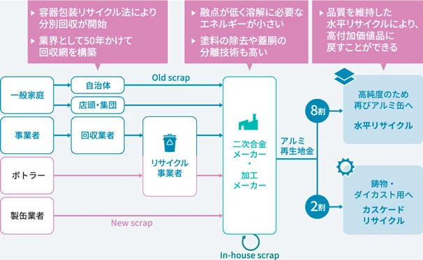 リサイクルの第一歩は分別回収で、日本国内における使用済みアルミ缶(Old Scrap)の回収網は自治体を中心に50年近くかけて構築されてきました。