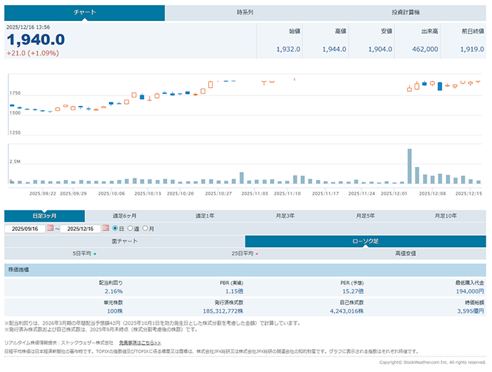 当社株価等の株式情報は、ストックウェザー株式会社から提供を受けて表示しております。