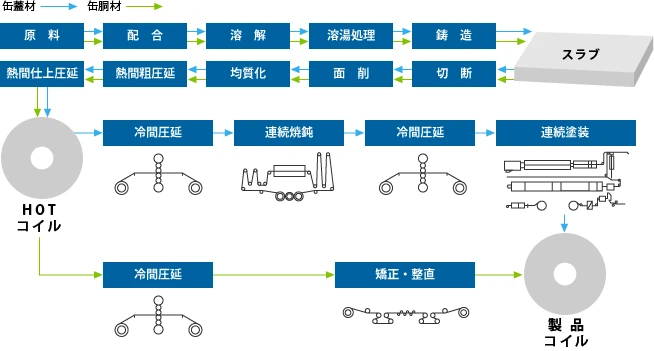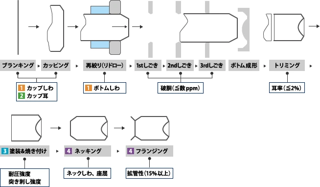 - 缶胴材は縮径化に対応、缶蓋材は高耐圧化(フルフォーム化)に対応しています。