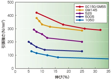- 代表的な構造用アルミ合金板のA5052に比べ、約1.5倍程度の強度があります。このため、板厚の薄肉化が可能となり、軽量化、コストダウンが計れます。