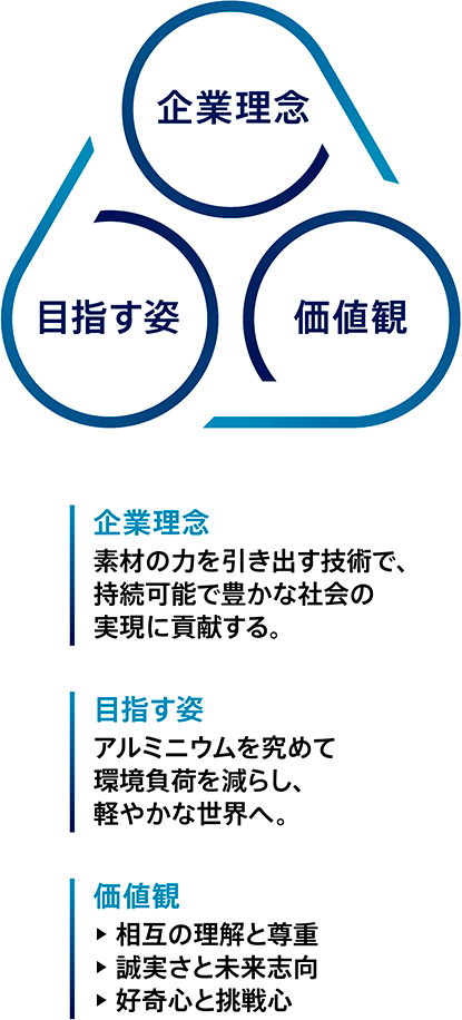 - 「目指す姿」 アルミニウムを究めて環境負荷を減らし、軽やかな世界へ。
