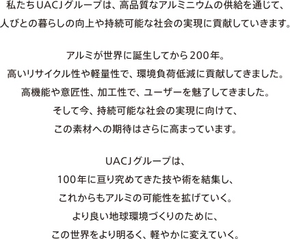 当社は、昨年2月に新企業理念体系を策定・発表しました。その後、トップマネジメント層と従業員が直接話し合う理念対話会を継続して実施し、グループ内で理念の浸透、実践へ向けた取り組みの促進を行ってまいりました。こうした中、企業としての社会への提供価値を考えた結果、アルミニウムの「軽い」「何度でも再生できる」といった特性を活かし、人びとの暮らしの向上や地球環境負荷低減を通じて、明るい未来に貢献していきたいという従業員の声をメッセージとしました。