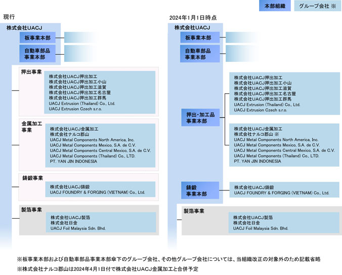 株式会社UACJ(本社:東京都千代田区、代表取締役:石原美幸、以下「当社」)は、UACJグループとして、さらに総合力を発揮していくことを目的に、2024年1月1日付で、押出・加工品事業本部と鋳鍛事業本部を新設する組織変更を実施することを決定しました。今後は、事業間でさらなるシナジー効果を発揮し、お客さまや社会のニーズに柔軟にお応えし、「素材+α」の付加価値を提供してまいります。