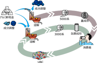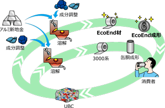 「EcoEnd」の開発により、今後は蓋にもより多くの使用済み飲料缶(UBC:Used Beverage Can)などの再生材が循環使用されることとなり、新地金の使用量削減にともなうGHG排出量の減少に繋がることが期待されます。これにより実現される新しいアルミ材循環フローは以下のとおりです。