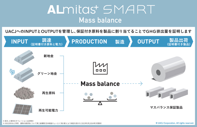 株式会社UACJ(本社:東京都千代田区、代表取締役:田中信二)は、グリーン原料を用いた環境保証材「ALmitas+ SMARTマスバランス」認証について、2023年4月の展開開始以来、日産自動車株式会社(本社:神奈川県横浜市、代表執行役社長兼最高経営責任者:内田誠)や積水樹脂プラメタル株式会社(本社:長野県上伊那郡辰野町、代表取締役社長:髙林周⼀郎)に採用いただいてきましたが、2024年5月から調達原料と対象製品群を拡大することを決定しましたので、お知らせします。