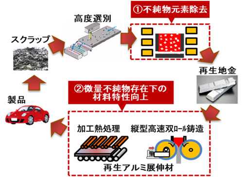 - ※2 資源循環型社会構築に向けたアルミニウム資源のアップグレードリサイクル技術開発プロジェクト:2021~2025年度の5カ年で、「①溶解工程高度化による不純物元素軽減技術」「②鋳造・加工・成形技術高度化による微量不純物無害化技術」などの組み合わせにより、アルミニウムスクラップから高性能な再生展伸材を開発することで、国内企業における製品の環境性能向上や資源制約の克服、GHG削減問題の解決を目指し、技術開発を実施。