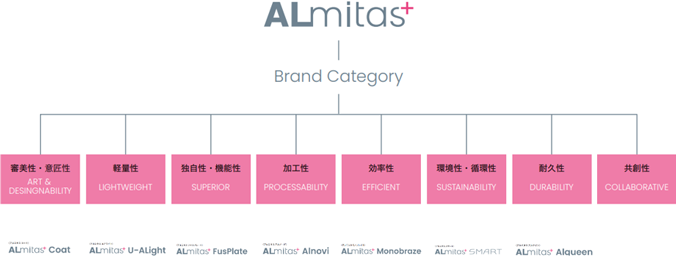 各製品ブランドの冠に「ALmitas+」を配し、ロゴデザインの統一を図ります。これにより、「ALmitas+」のブランドメッセージである“アルミっておもしろい”をより印象付け、グループと、アルミニウムという素材そのもののプレゼンスを向上させられるブランディングを展開していきます。