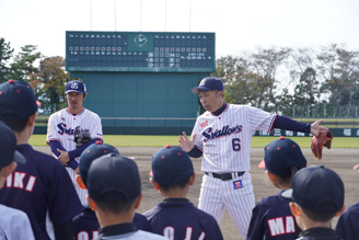 講師陣は子どもたちに対し、ボールの握り方やバッティング時のタイミングの取り方などといった技術面のポイントのほか、「学んだことを継続することが大切」「野球を大好きになることが上手になるコツ」「記憶力は磨いたほうが良い」などといった心構えも伝授しました。また、「プロ野球選手になるにはどうしたら良いか」「どうしたら力がつくか」「中学生になったら軟式野球と硬式野球のどちらをするのが良いか」といった子どもたちからの質問に対し、丁寧に回答していました。子どもたちは、元気よく練習に励み、「今日習ったことを生かして、もっと練習してうまくなりたい」と伝えていました。