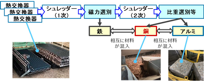 熱交換器は、空調機において空気を冷やしたり暖めたりするための重要な部品の一つで、内部の銅管を流れる冷媒の熱を、アルミフィンを通じて空気に伝えます。使用済み熱交換器のマテリアルリサイクルでは、一般的に熱交換器をシュレッダーにかけて細断し、使用されているアルミ・銅・鉄などが金属毎に選別されますが、選別されたアルミの成分に、銅やその他不純物が含まれてしまい、高い加工性が求められる熱交換器用フィン材への水平リサイクルは困難でした。
