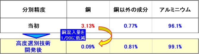 そこで、リサイクルサイトを運営する日本磁力選鉱は、アルミと銅の高度選別技術を開発し、当初3%程度あった銅成分を0.1%以下にまで低減することに成功し、素材メーカーのUACJは、銅をはじめとする不純物成分が含まれる場合に課題となるプレス成形性を改善したアルミ材を開発しました。最終的に、そのアルミ材を用いて、ダイキンがフィンプレス成形、熱交換器製作までを行い、使用済み熱交換器から新しい熱交換器への水平リサイクルができることを実証しました。