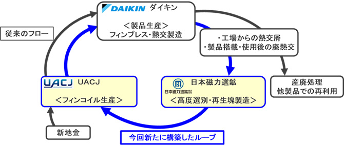 日本磁力選鉱株式会社(本社:福岡県北九州市、代表取締役社長:原田 信、以下 日本磁力選鉱)、ダイキン工業株式会社(本社:大阪府大阪市、代表取締役社長兼COO 竹中 直文、以下 ダイキン)、株式会社UACJ(本社:東京都千代田区、代表取締役:田中 信二、以下 UACJ)は、このほど、空調機の熱交換器の水平リサイクル※1技術を共同で実証しました。空調機のアルミフィンの再生技術の実証実験の成功は、業界で初めて※2となります。