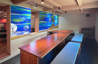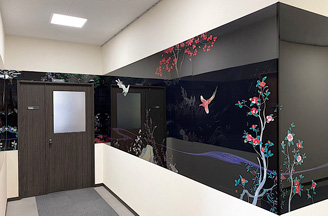 本アルミアートパネルは、UACJ名古屋製造所で製造し金色に着色塗装したアルミ板を使用し、上坂氏の絵柄を、UACJ金属加工・滋賀工場で繊細な色彩と風合いに表現したものです。上坂氏にはこれまでにも、UACJ金属加工で製造する納骨壇の専用絵柄をデザインしてもらってきており、このほど11m×2mの壁面用のベクターアート※を作成しました。上坂氏からは、アルミニウムをアートパネルの土台に使用することのメリットとして、作品が長く残る耐久性や、素地の金色を生かすことのできる点、つやの高級感などを高く評価いただいています。