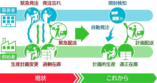本サービスは、アルミ箔の破断を検知することで開封や使用を把握する「お知らせ箔」を活用し、サプライチェーン全体の在庫戦略の一助になることを目指すものです。現場に行かずに在庫消費を検知できるほか、補充の優先順位付けや配車計画なども自動化・高度化できます。近年、在庫管理が必要な事業において、広域エリアでの巡回の負担や人材確保の難しさが深刻化しています。本システムを利用することで、営業や物流の巡回や緊急出動を抑制し、欠品リスクを低減できます。特に、北海道のような広域や豪雪の地域における、効率的なエリア運営に貢献します。