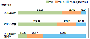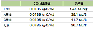 当社では,熱源としての燃料には,主に重油,LPGおよびLNG※を使用しています。LNGは,重油に比べて発熱量あたりのCO2排出量を約3割削減することができるため,当社は2003年以来,LNGへの燃料転換を進めてきました。図3に燃料比率の推移を示します。また,表1に燃料別のCO2排出係数および発熱量を示します。最近の原油価格の高騰を受けて,今後さらに燃料転換を促進し,2009年度には,全エネルギー中のLNG 比率を32%に,また電力を除いた燃料中のLNG 比率を62.8%にまで高める予定です。