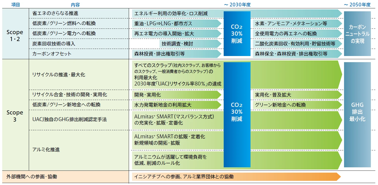 気候変動への対応は、社会全体で取り組むべき喫緊の課題となっています。この責務を果たすために、当社では温室効果ガス(GHG)排出量の削減を含めた「カーボンニュートラルの実現」を重要課題の一つと位置づけ、事業活動を通じて排出するGHGの削減だけではなく、アルミニウムの利活用の機会を拡大していくことなどによって、社会全体におけるGHG排出量の削減、持続可能な社会形成に貢献していきます。