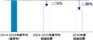 当社のGXリーグにおけるCO2等のGHG排出量削減目標(Scope1・2合計)は、2014年度から2016年度までの3カ年平均を基準として、2024年度と2025年度の平均で19%削減、2030年度で30%削減する計画です。この内容はGXリーグ事務局の承認を受けています。