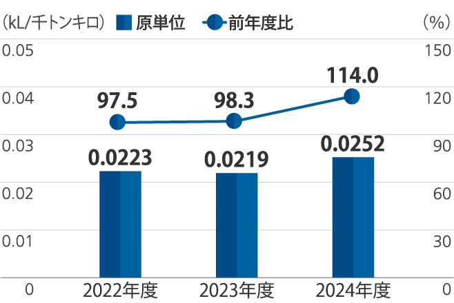 2024年度は、販売量あたり輸送エネルギー原単位は、2023年度比で14.0%悪化しました。その要因は、名古屋製作所、小山製作所、鋳鍛製作所を統合したため、3事業場は、製品構成が比較的小ロットで、輸送時のエネルギー原単位が悪いためです。