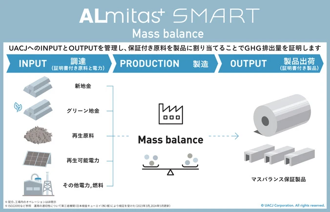 2023年4月からはグリーン電力由来のアルミ新地金やクローズドループで回収された端材などを第三者機関検証を受けたマスバランス方式で管理し、 温室効果ガス排出原単位を保証した「ALmitas⁺ SMART(マスバランス方式)」を追加することで、 環境性能を重視するお客様の選択肢を広げました。